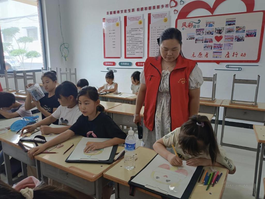 实践活动过程中,志愿者们引导孩子们从身边看到过的卡通形象开始,思考卡通形象设计的过程,并分组教学,手把手的教孩子们怎样勾勒线条和上色。孩子们一边仔细地听着志愿者们的教学,一边自己动手,认真地在画纸上涂画着。从简单的线条勾勒到色彩的搭配运用,孩子们在实践中逐渐掌握了绘画的基本技巧。看到自己亲手完成的作品,孩子们的脸上都洋溢着天真灿烂的笑容。