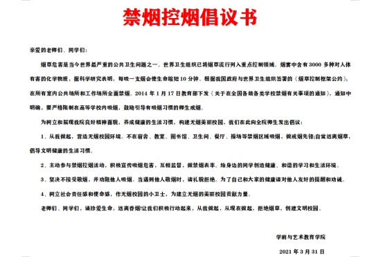 活动期间,公司团总支向全院师生发出了禁烟控烟倡议书,组织各班级开展了一次禁烟控烟主题班会。班会上,通过对禁烟知识的讲解,让同学们进一步认识到吸烟的危害。同学们宣读禁烟誓词,表达了创建无烟环境,共建文明校园的决心。